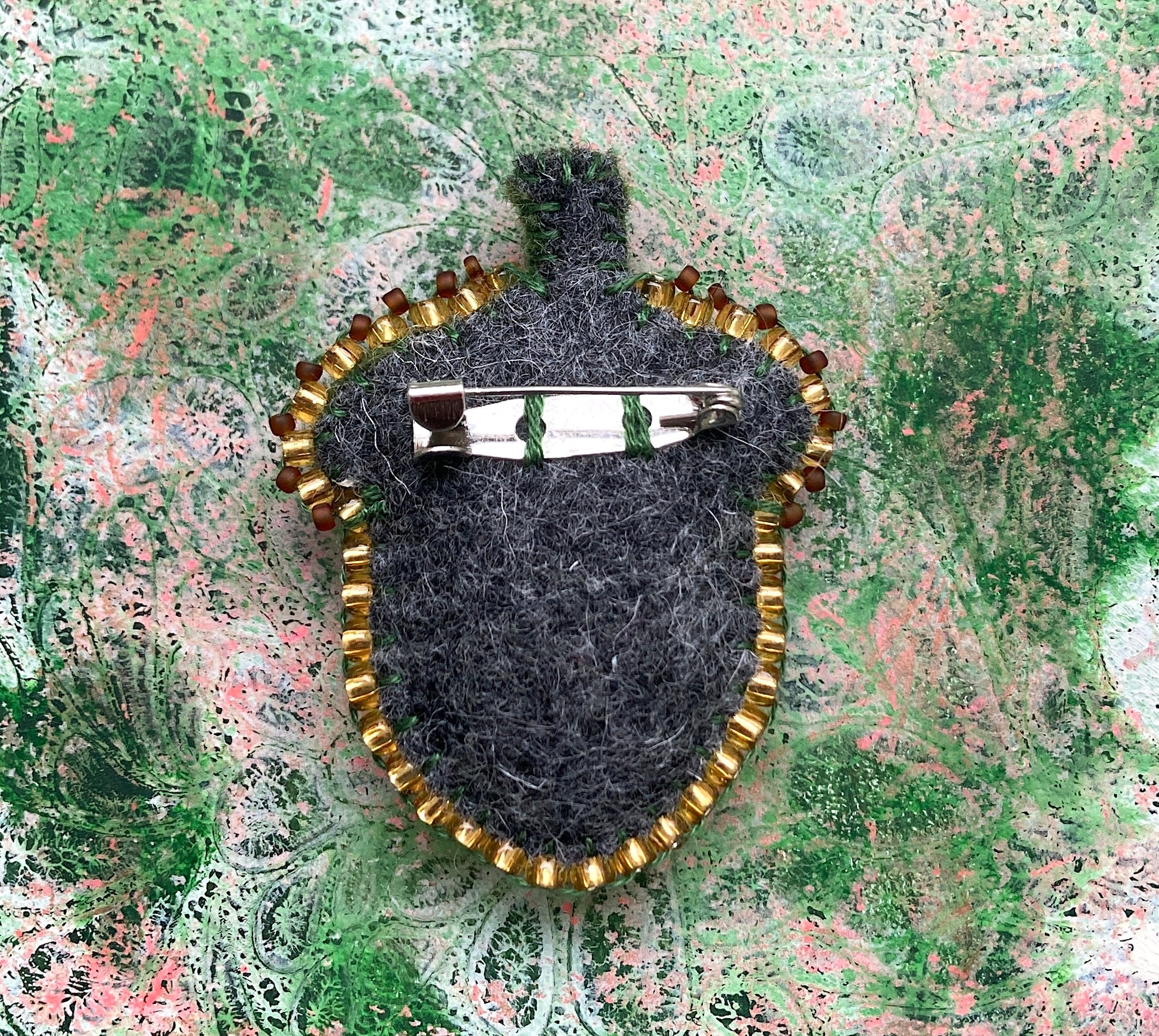 Beaded acorn brooch stitched with ,metallic thread and glass seed beads