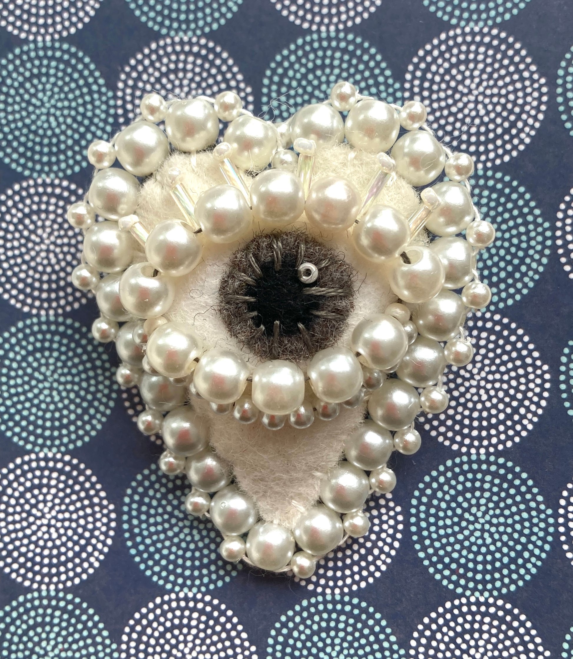 Chunky hand stitched heart and eye brooch. Stitched with wool felt and ivory pearls
